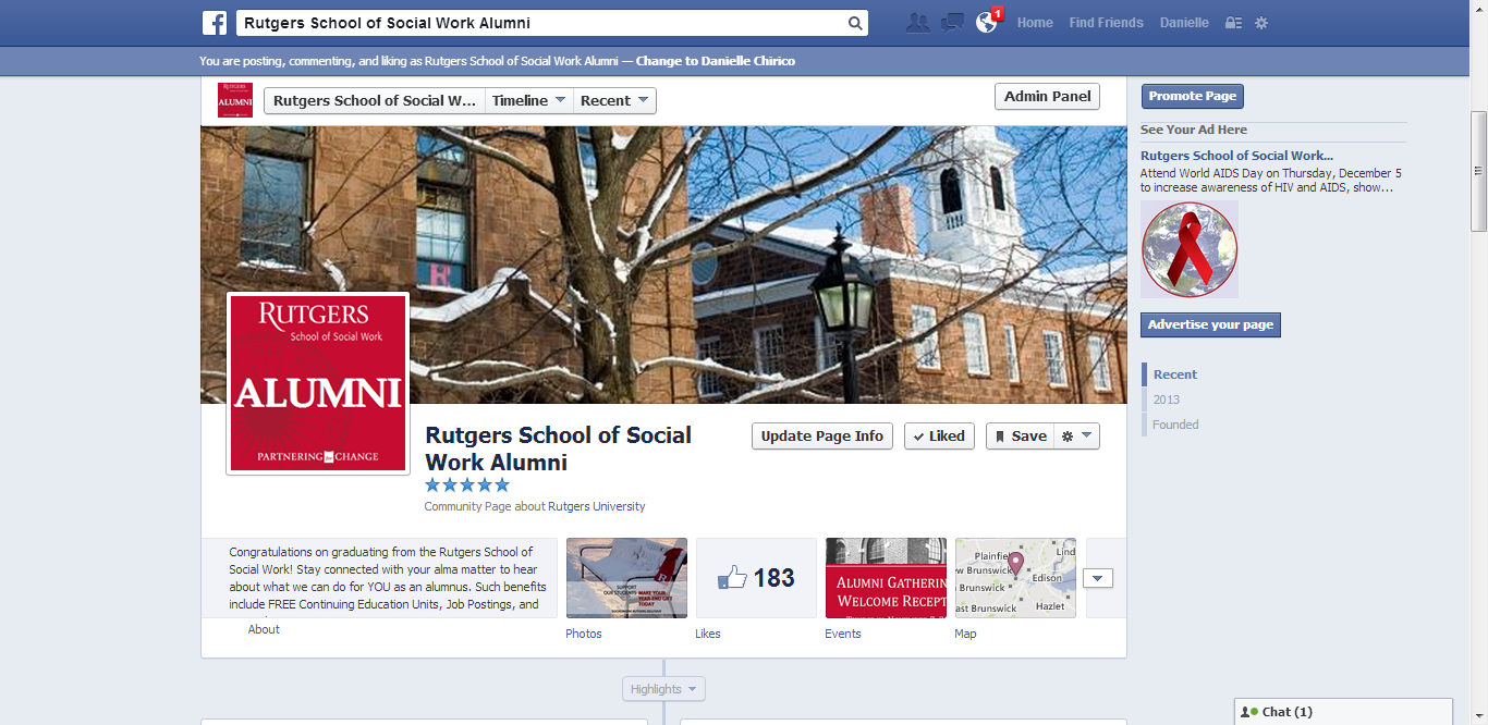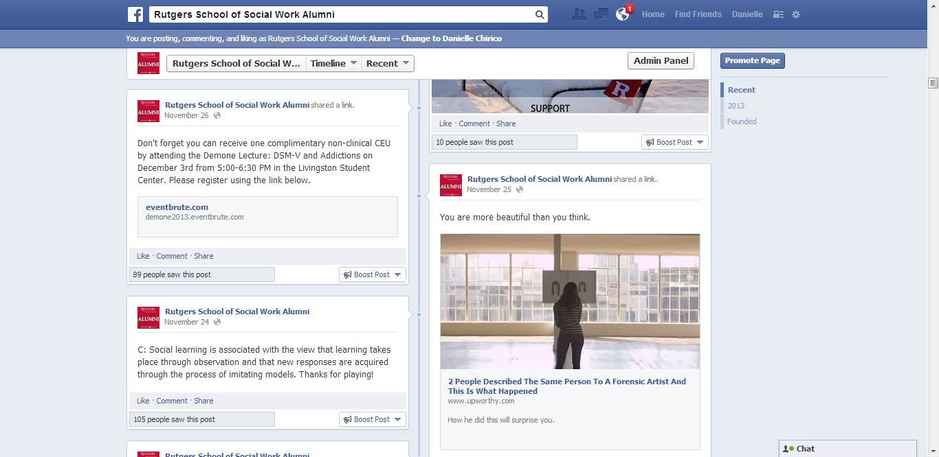 As a writing intern for the Rutgers School of Social Work, I launched the school’s first social media campaign aimed at engaging alumni and saw a 60 percent increase in Facebook likes. I posted content on a week by week basis with a post for every day of the week on the Rutgers School of Social Work Alumni Facebook page.